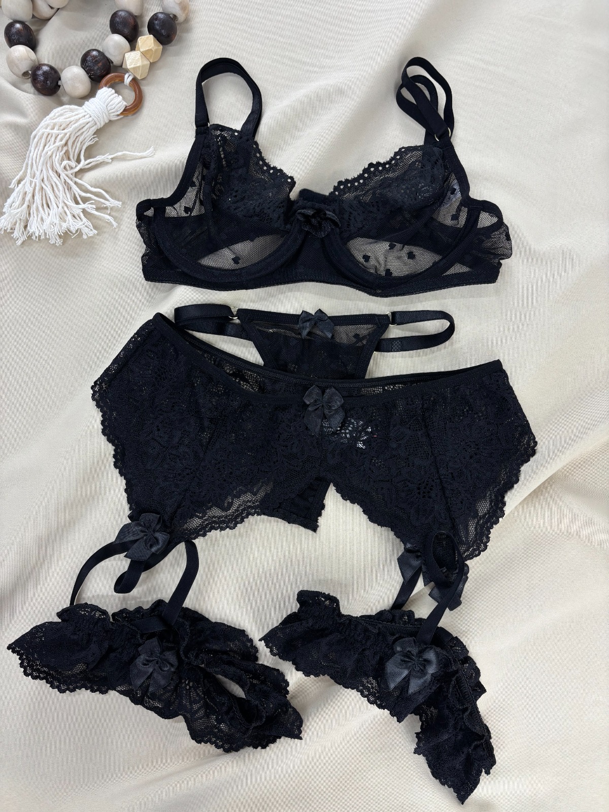 A cinta-liga completa o conjunto com um visual irresistível, trazendo mais ousadia e sofisticação. Os detalhes em renda e laços criam uma composição envolvente, perfeita para quem deseja elevar o nível da lingerie e da autoestima.
